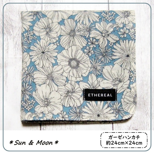 【大人のガーゼハンカチ】線画の花柄・サックスブルー