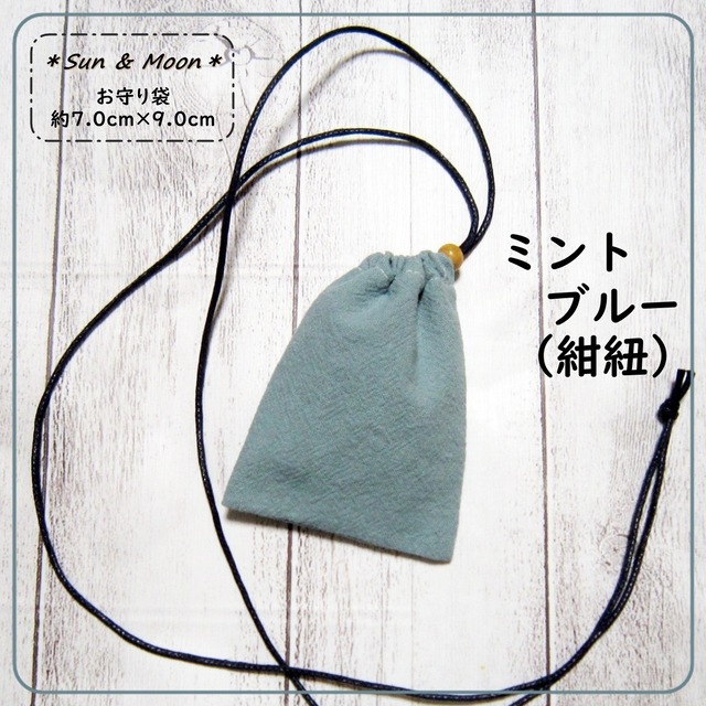 【ミントブルー(紺紐)】(綿スラブワッシャー・やや厚め)首から下げられる、巾着袋・お守り袋・ストーン入れ・鍵袋