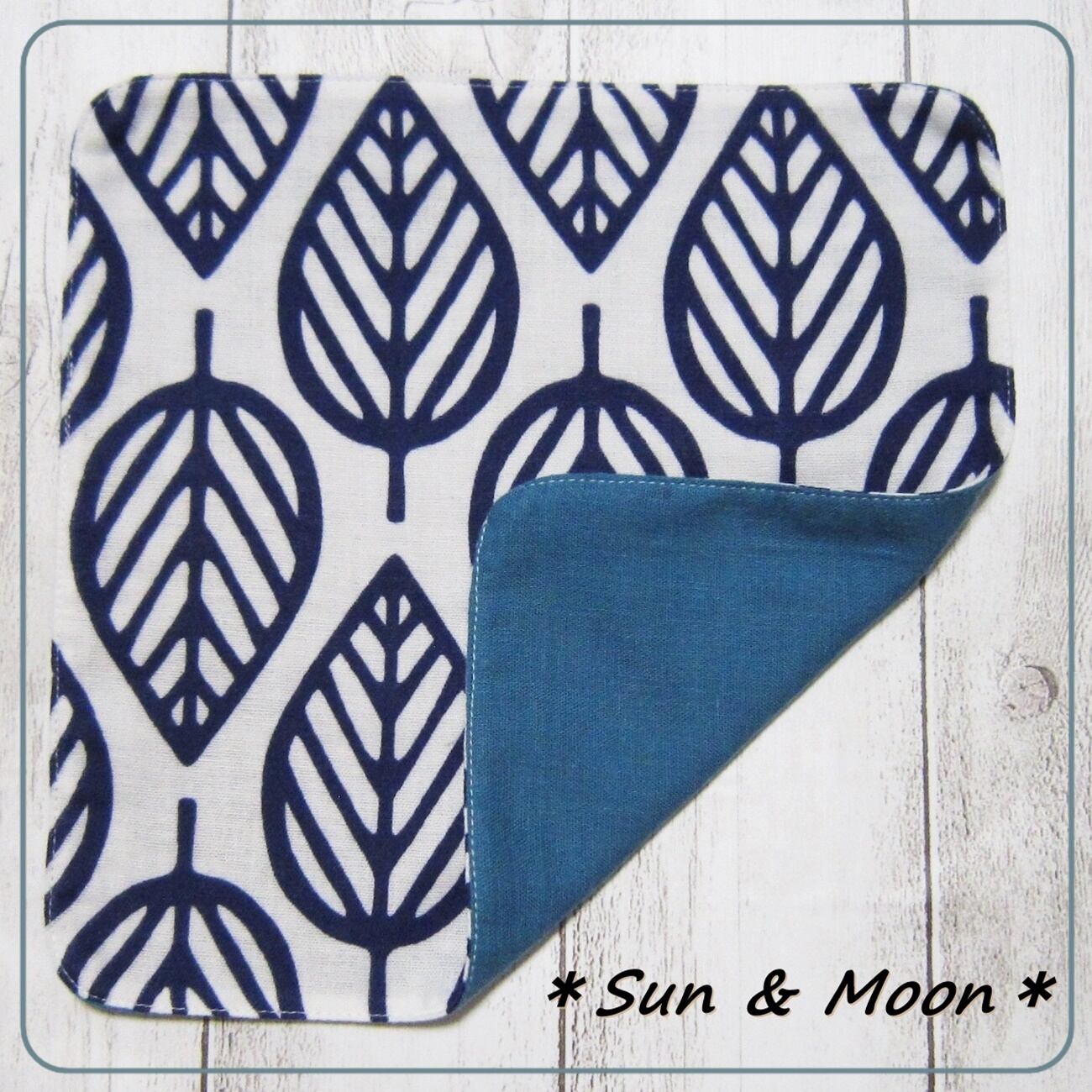 【子供のガーゼハンカチ】大きめリーフ柄・ネイビー・約20cm×20cm