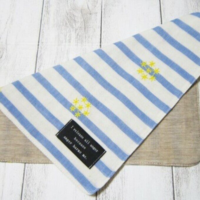 【大人のガーゼハンカチ】小花の刺繍がかわいい、ボーダー・約24cm×24cm