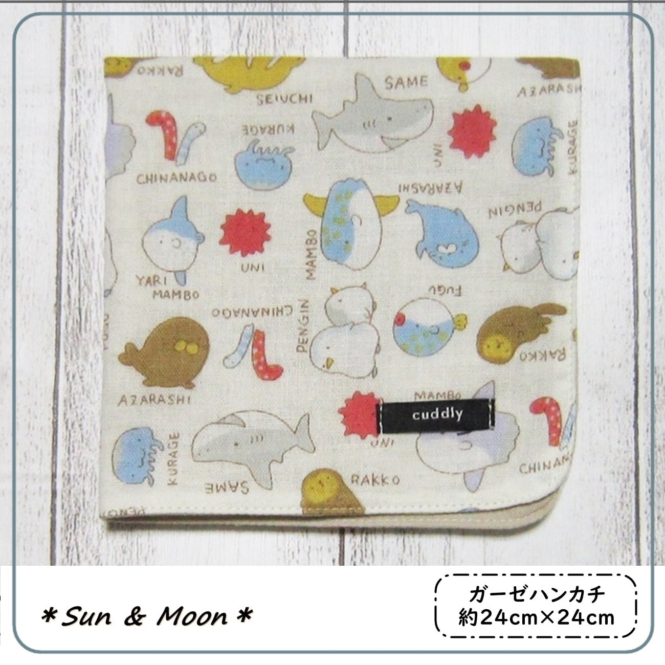 【大人のガーゼハンカチ】海の仲間たち・ホワイト・約24cm×24cm