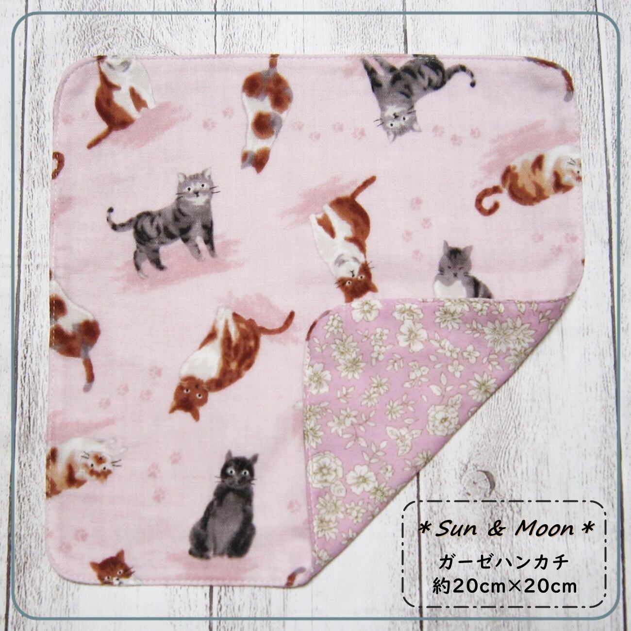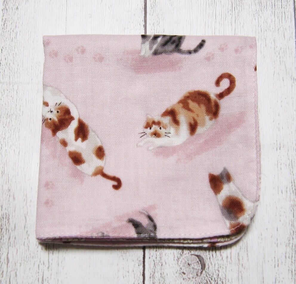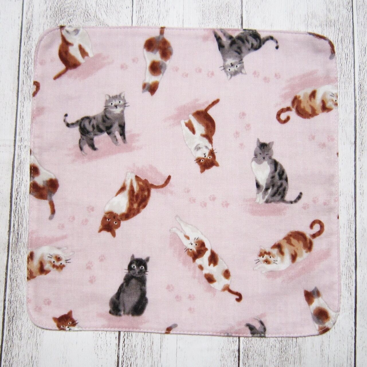 【子供のガーゼハンカチ】歩くネコ&足あと・ピンク