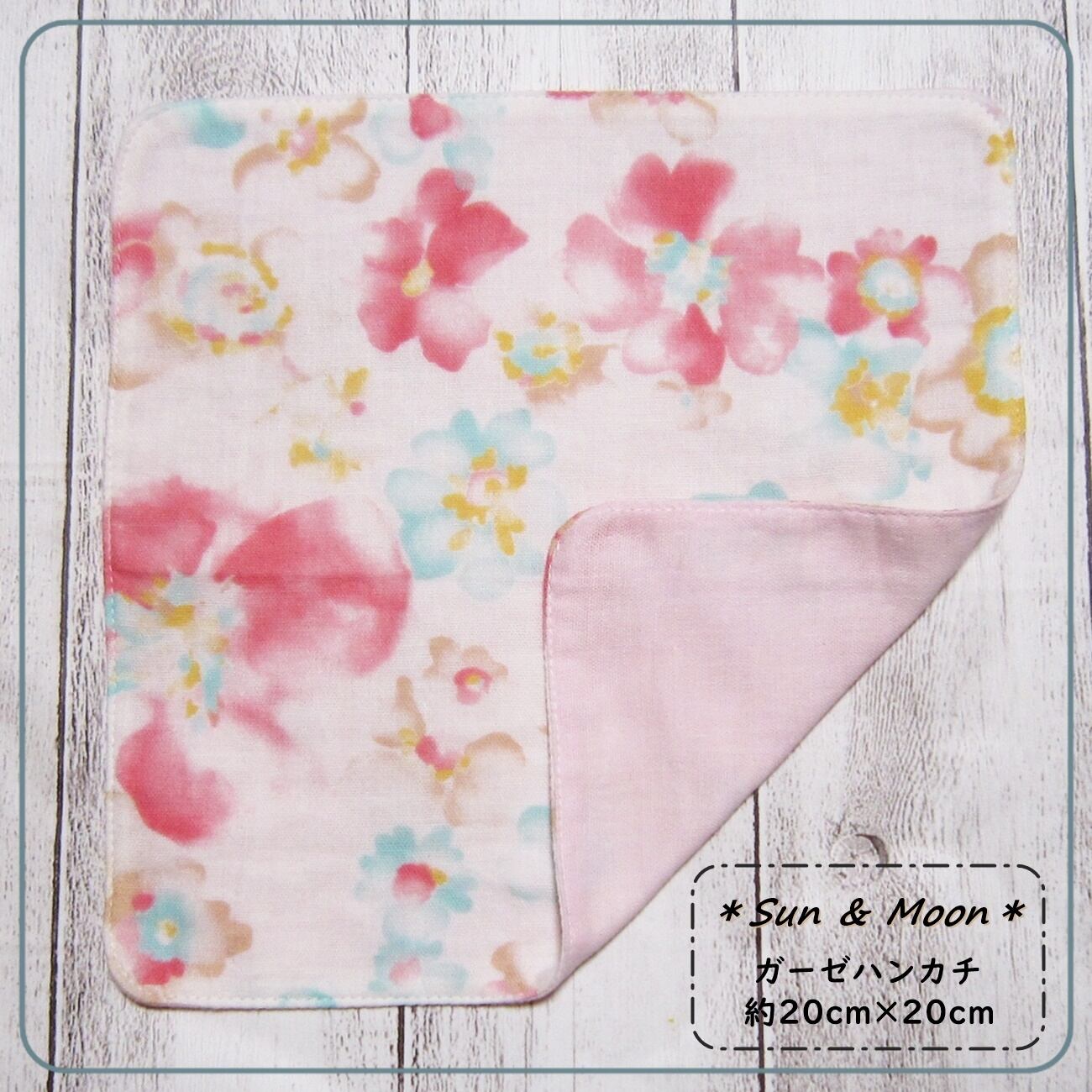 【子供のガーゼハンカチ】水彩風の花・ピンク